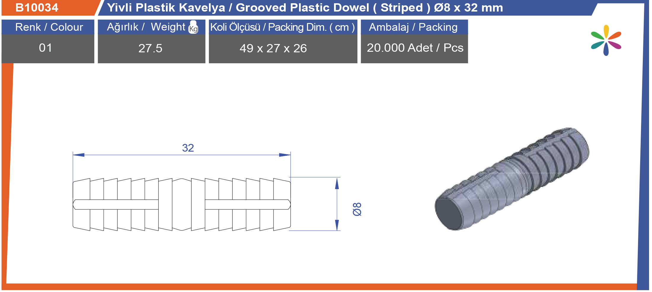 Product Name: Ø8x32 mm Grooved Plastic Dowel