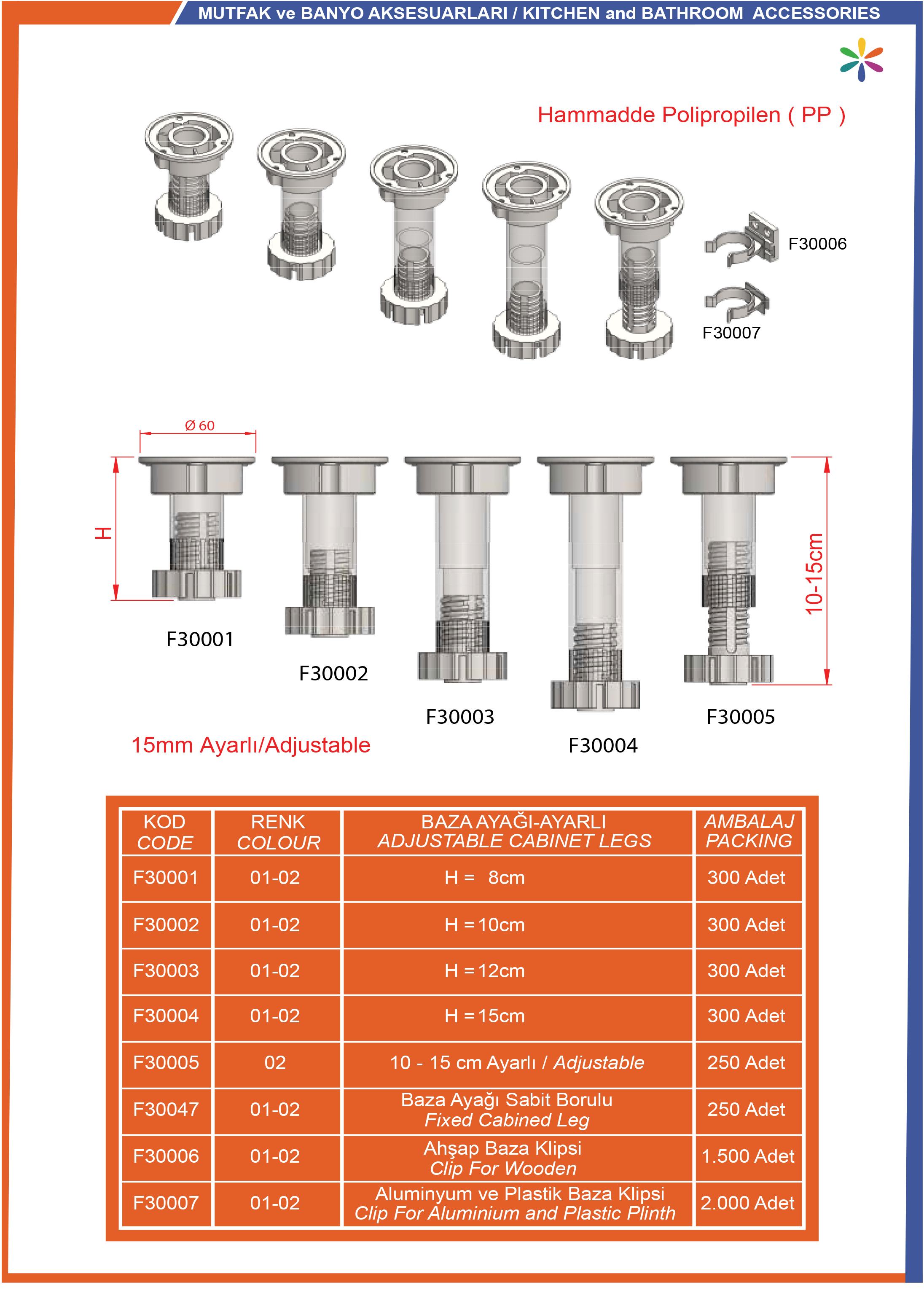 Baza Ayağı 10 - 15 cm Ayarlı Siyah, mutfak tezgahları, banyo tezgahları ve mobilya tabanları altına montaj için ideal olan yüksek kaliteli ve ayarlanabilir bir üründür. Bu baza ayağı, dayanıklı ve uzun ömürlü polipropilen malzemeden üretilmiştir. Siyah rengi sayesinde estetik bir görünüm sunar ve çeşitli dekorasyon stilleriyle uyum sağlar. Ayarlanabilir yapısı ile farklı yükseklik ihtiyaçlarına kolayca uyum sağlar. Ürün, ambalajında 300 adet olarak satışa sunulmaktadır.